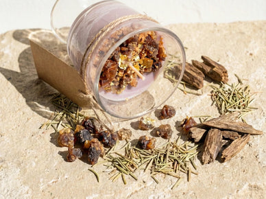 Her forener vi den opkvikkende rosmarin, den harpiksagtige myrra og den mystiske oud i et helligt åndeligt ritual af sammensmeltning. Processen begynder med indblødning af ægte rosmaringrene og oud-flager i to uger, før de længe trækker i det varme voks. Denne teknik fanger planternes opkvikkende energi i selve materialet.