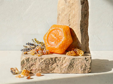 Det første møde med denne økologiske håndlavede sæbe er et møde med lys. Dens ravgyldne, varme og trygge farve fremkalder straks bistadernes flydende guld og solens varme. Ved berøring er teksturen fast, men lover en sjælden blødhed. Så snart den møder vand, frigiver den et fint og cremet skum, som en mælkeagtig salve, der glider over huden uden nogensinde at irritere.