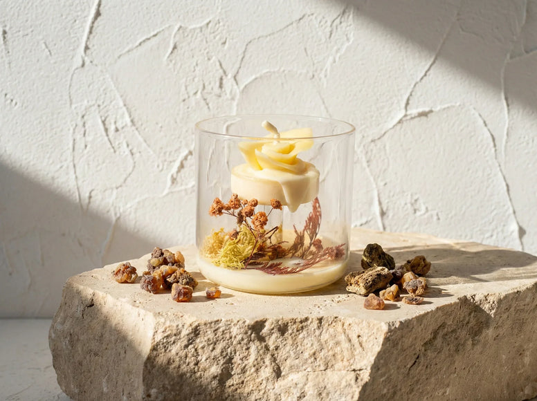 The immersion begins with the gaze, drawn to the irregular and organic texture of the wax visible through the glass. The myrrh fragments surface, bearing witness to the artisanal and raw character of this piece. On the nose, a dense and mystical olfactory creaminess unfolds from the moment of lighting.