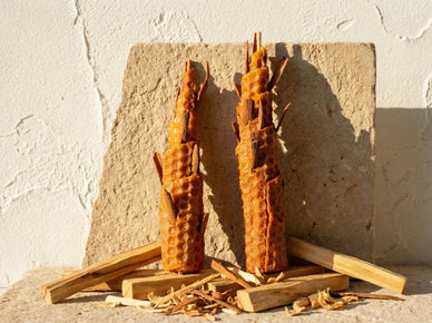 The visual experience is of great organic nobility. The golden wax reveals the brown shards of crushed Palo Santo on the outside of the spiral, creating a contrast that evokes earth and sun.