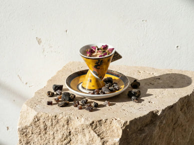 - Soporte: Vaso y portaplato egipcio amarillo.