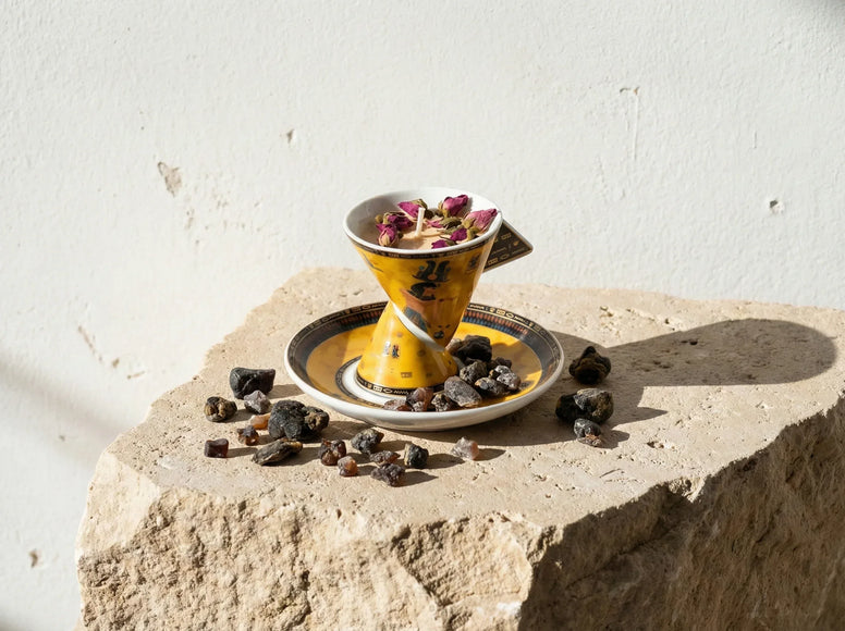 Visualmente, esta vela cautiva por su aparente suavidad. Vertida en su vaso protector, se posa sobre un portaplato egipcio amarillo luminoso, símbolo de la luz solar y de la alegría recuperada. La cera, de textura fluida y aterciopelada, deja entrever los polvos aromáticos en suspensión, creando una estética preciosa y esotérica.