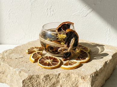 Ta ręcznie wykonana naturalna świeca to prawdziwa eksplozja światła i radości, stworzona, by obudzić słoneczną energię drzemiącą w każdym miejscu. Tworzenie opiera się na użyciu bio krystalicznego wosku żelowego, którego przejrzystość pozwala uwydatnić składniki aktywne. Używamy prawdziwych skór z cytryny ekologicznej oraz cienkich plasterków suszonych owoców cytrusowych, nasączonych przez czternaście dni w musującej bio olejku eterycznym.