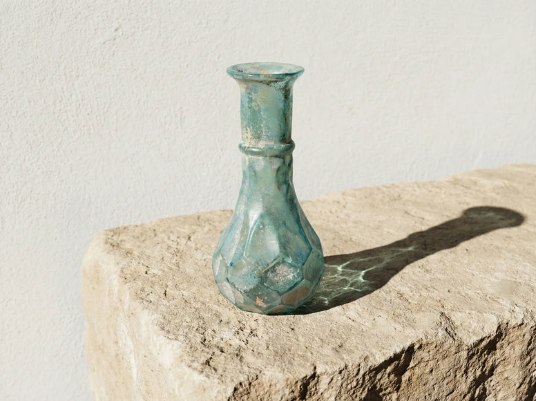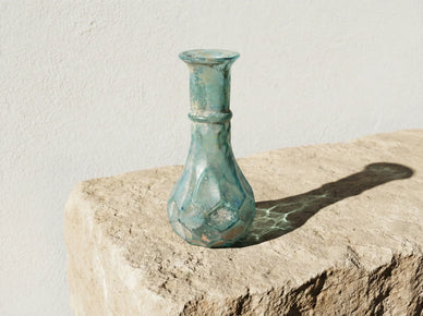 Chaque fiole est nettoyée à la main pour dégager les facettes tout en laissant la patine dans les interstices pour accentuer le contraste. C'est un produit haut de gamme artisanal qui témoigne de la richesse décorative de l'antiquité. En possédant cette fiole vous possédez un exemple de l'amour des anciens pour la beauté complexe et structurée un talisman de beauté durable et inspirant.