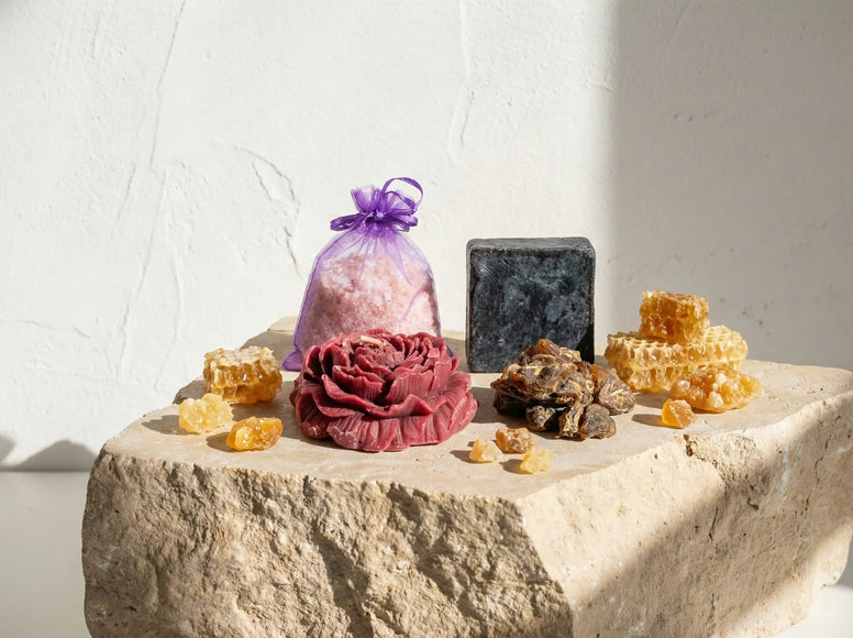 Atölyemizde yavaşça dökülen mum, doğal tozlar ve hafifçe çıtırtı çıkaran Palo Santo parçalarını içerir; bu, koruyucu bir ruhani enerji yayar. Geleneksel reçine tütsüsü doukhoun, burada gizli bir adaçayı ve misk oranıyla yeniden yaratılmış, yoğun ve arındırıcı bir tütsü sağlamak için elde öğütülmüştür.